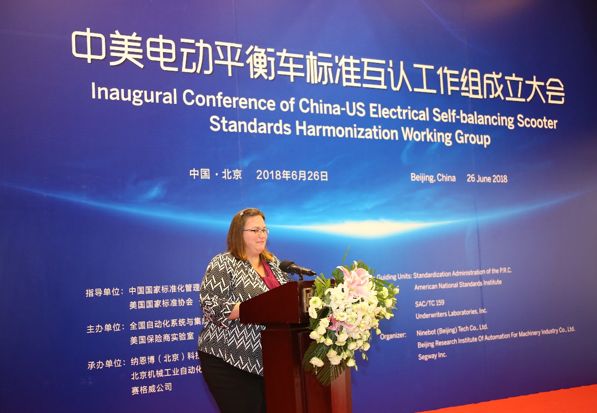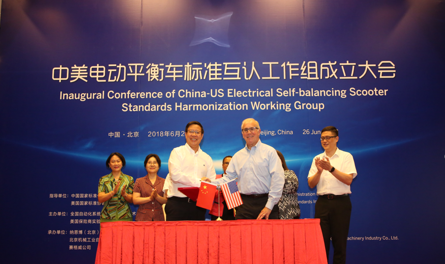6月26日,中美電動(dòng)平衡車標(biāo)準(zhǔn)互認(rèn)工作組成立大會(huì)在北京唯實(shí)大廈成功舉行。全國(guó)自動(dòng)化系統(tǒng)與集成標(biāo)準(zhǔn)化技術(shù)委員會(huì)主任委員、機(jī)械總院集團(tuán)董事長(zhǎng)王德成與美國(guó)保險(xiǎn)商實(shí)驗(yàn)室全球副總裁 Philip M.Piqueira分別代表中美雙方簽署電動(dòng)平衡車標(biāo)準(zhǔn)互認(rèn)合作協(xié)議。中國(guó)國(guó)家標(biāo)準(zhǔn)化管理委員會(huì)副主任殷明漢、IEC美國(guó)國(guó)家委員會(huì)副主席Sonya Bird、美國(guó)大使館參贊Cynthia Griffin、北京航空航天大學(xué)教授王田苗、全國(guó)自動(dòng)化系統(tǒng)與集成標(biāo)準(zhǔn)化技術(shù)委員會(huì)秘書(shū)長(zhǎng)黎曉東、Segway-Ninebot公司總裁王野等領(lǐng)導(dǎo)及電動(dòng)平衡車國(guó)家標(biāo)準(zhǔn)起草組專家出席會(huì)議,共同見(jiàn)證了中美兩國(guó)標(biāo)準(zhǔn)化合作的歷史時(shí)刻。