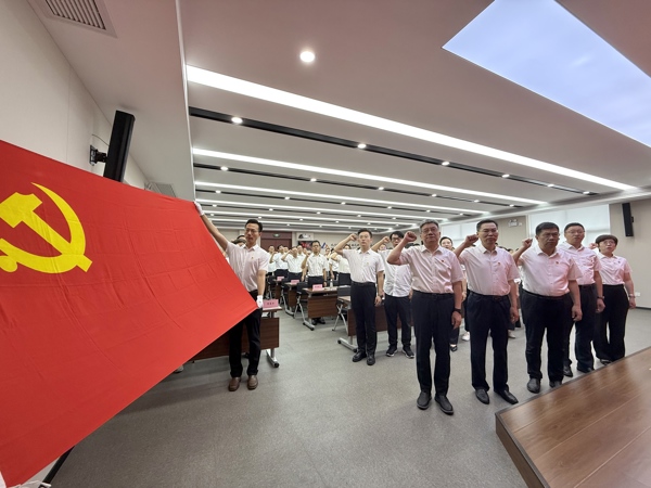大會在莊嚴(yán)的國歌中拉開序幕。王振林帶領(lǐng)新接收預(yù)備黨員進(jìn)行集體宣誓,老黨員們重溫入黨誓詞。